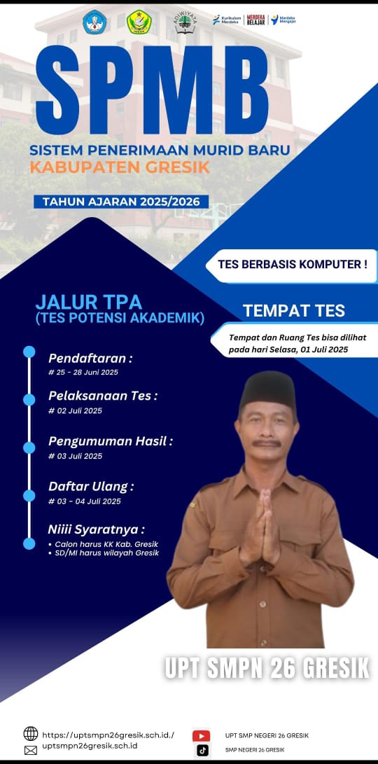 Berikut adalah informasi penting terkait SPMB Tahun Ajaran 2025/2026 , kami dengan penuh semangat siap menyambut generasi baru yang akan bergabung dengan keluarga besar UPT SMPN 26 Gresik. Jangan lewatkan kesempatan ini untuk menjadi bagian dari sekolah yang berkomitmen pada pendidikan berkualitas dan pengembangan karakter. Terus pantau informasi lebih lanjut untuk detail pendaftaran, syarat, dan prosedur penerimaan. Mari bersama-sama mewujudkan masa depan yang cerah!.